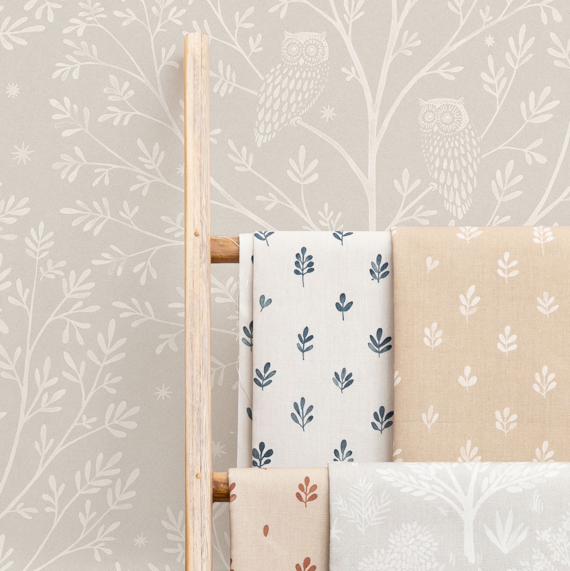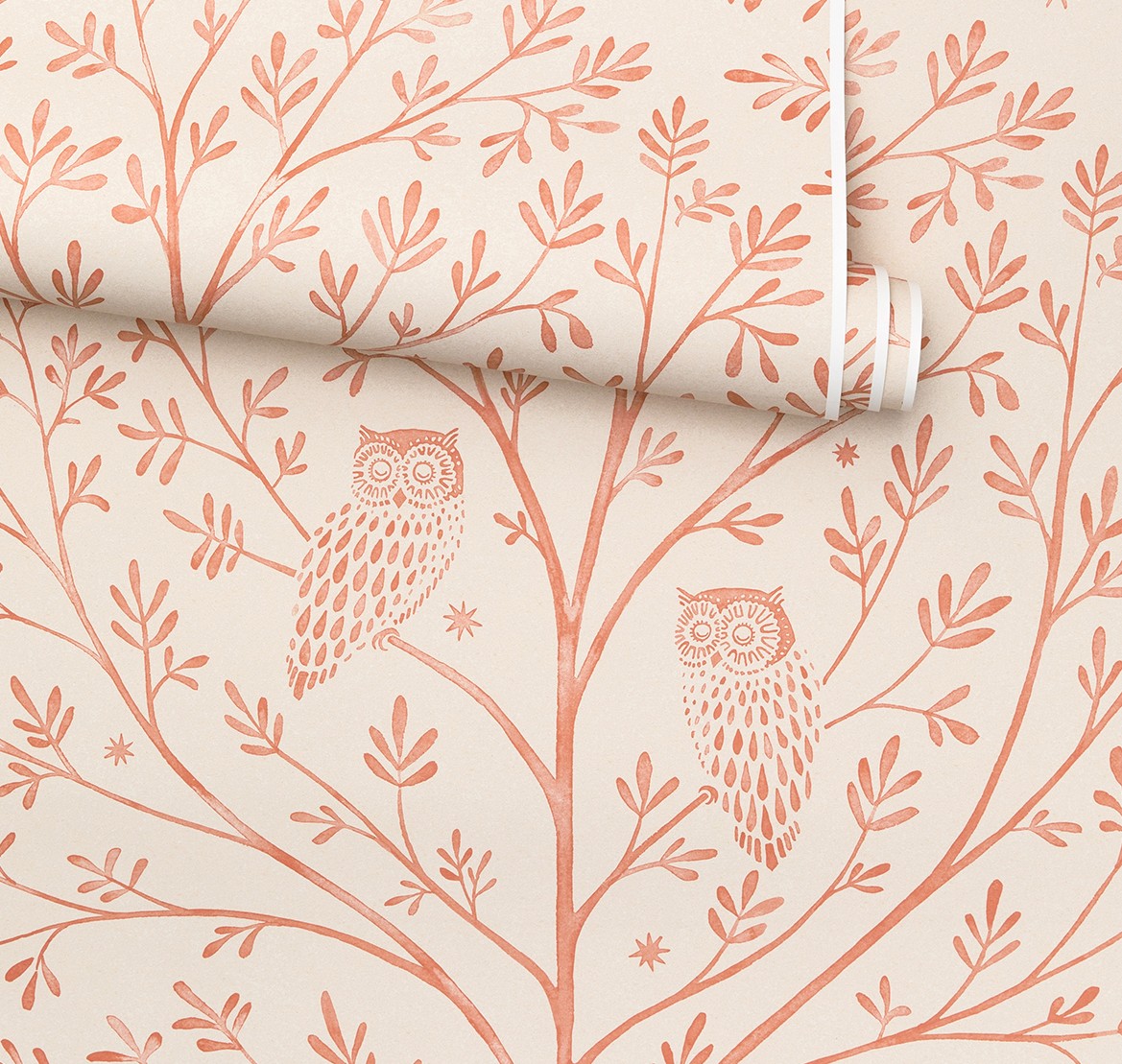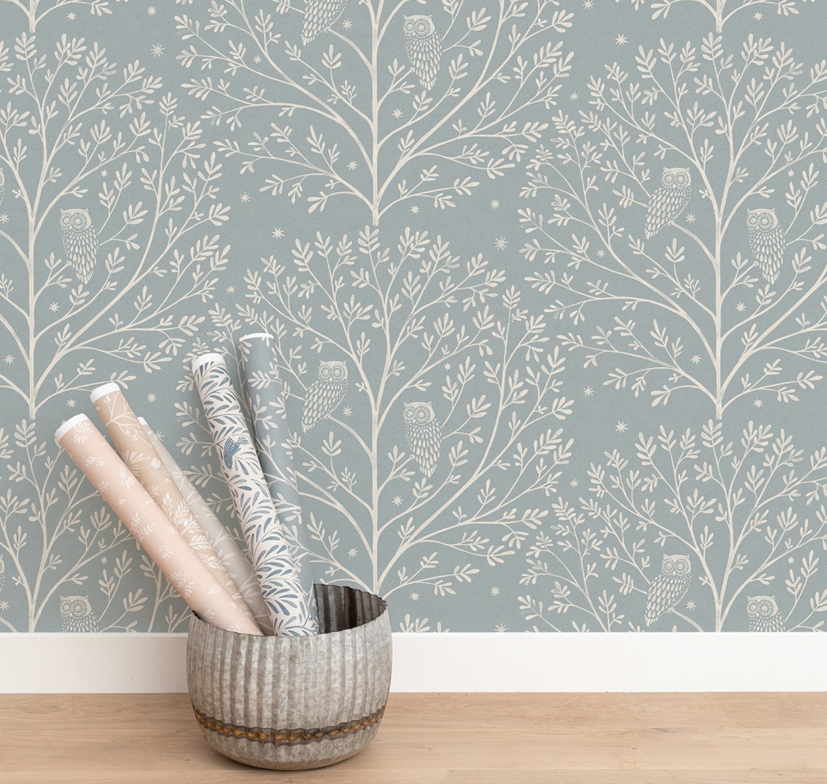 Two wise owls are taking forty winks in NIGHT OWLS. Sitting in a huge lolly-pop tree, the owls are surrounded by a quiet starry night. An adorable wallpaper perfect for a pretty bedroom or nursery - ‘Goodnight Owls!’.