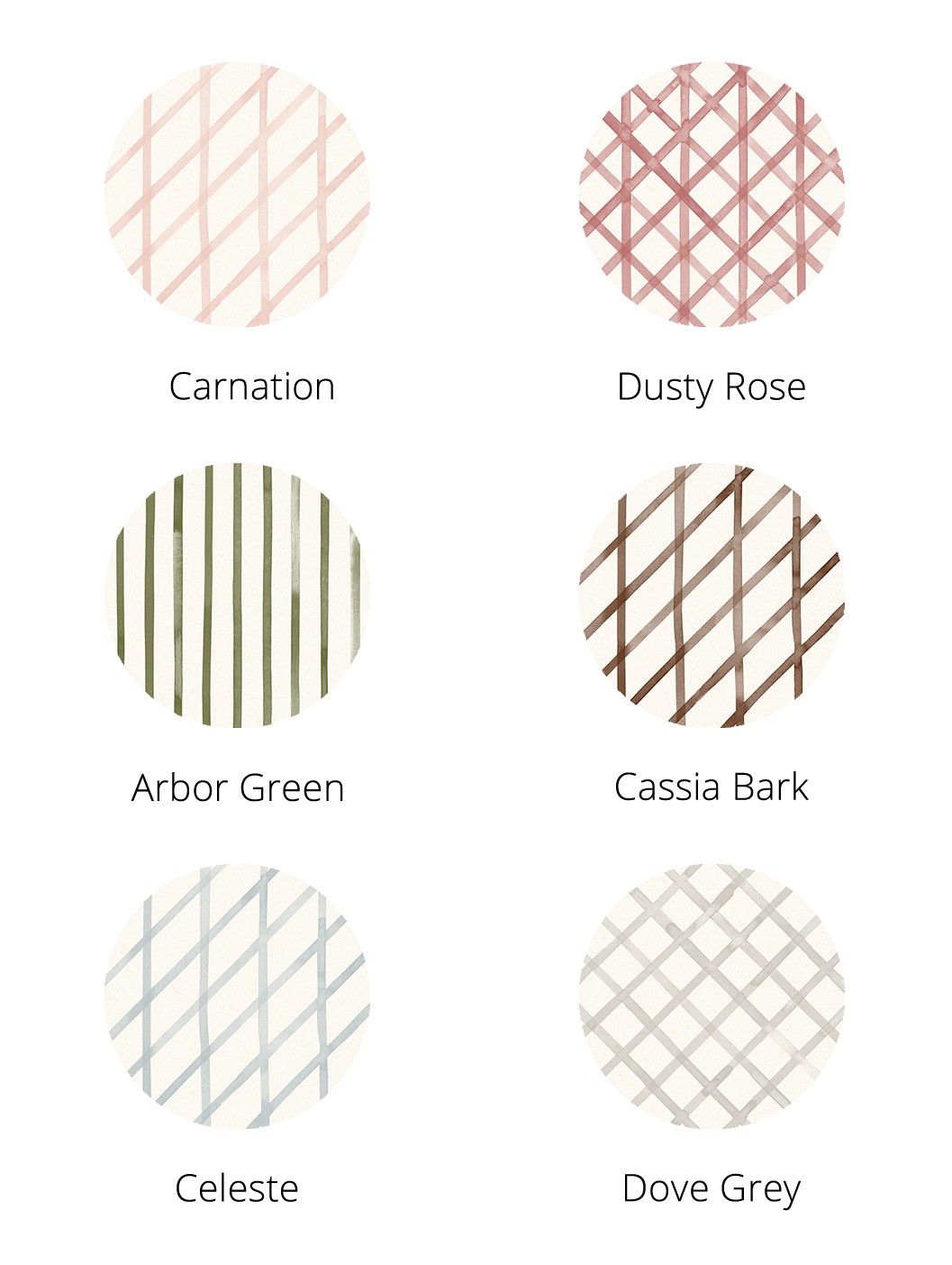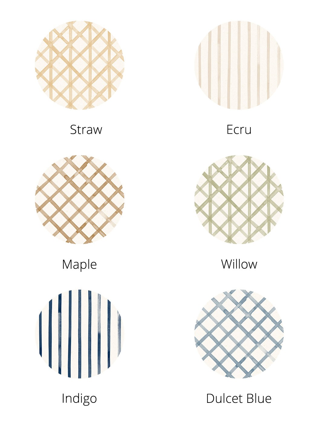 We have chosen 12 delicious colours divided across all four patterns; however, you can order any of these colours in any of the designs. If you would like a sample for a colour combination not shown in the collection, please let us know.