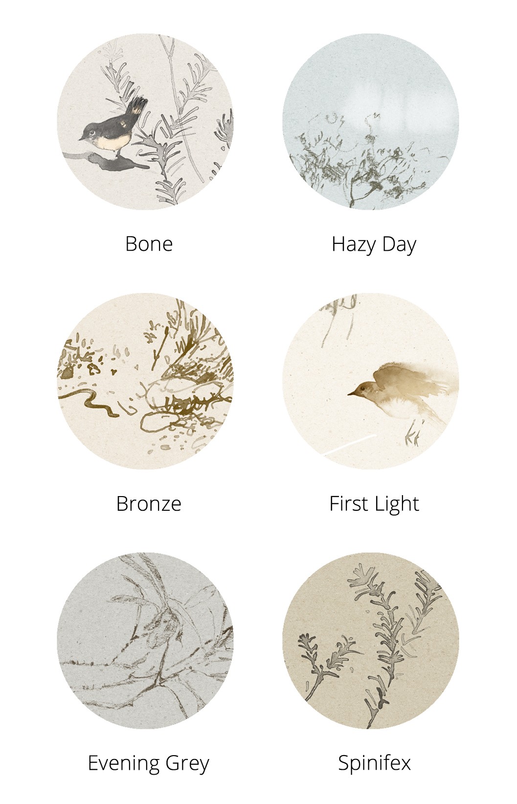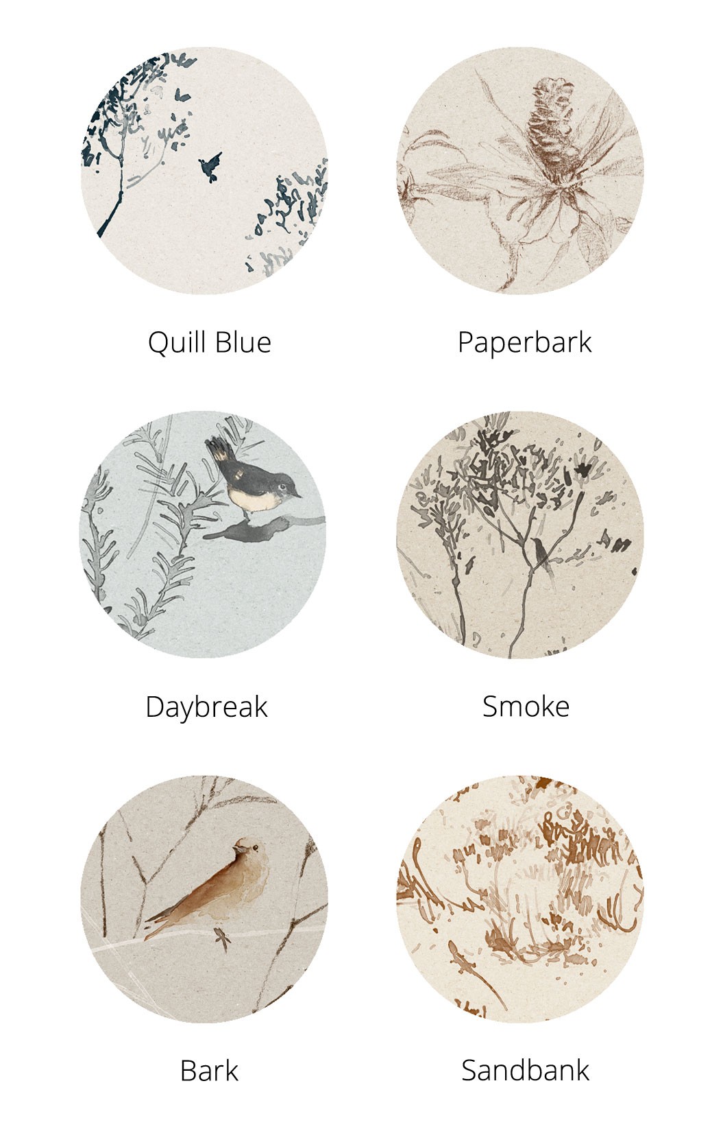 Two of the original patterns - Heath Banksia and Canopy - have continued to be favourites in various colour iterations since their first release, and now feature longside a re-release of Coastal Banksia and a new ink sketch similar to a French ‘Toile-de-Jouy’ design called Dunes.