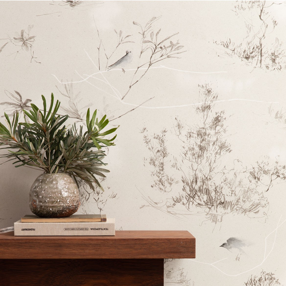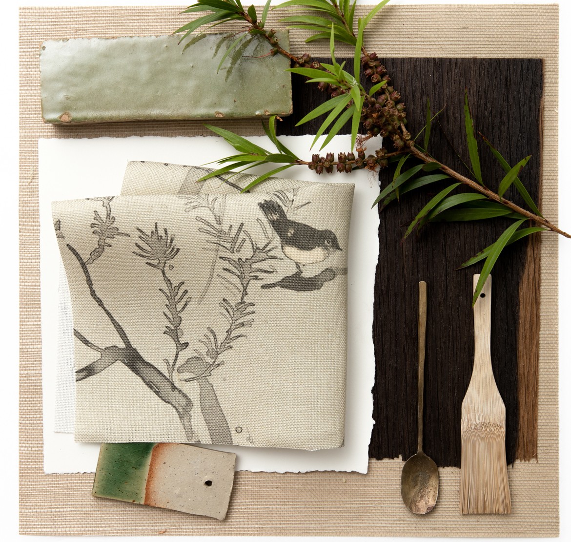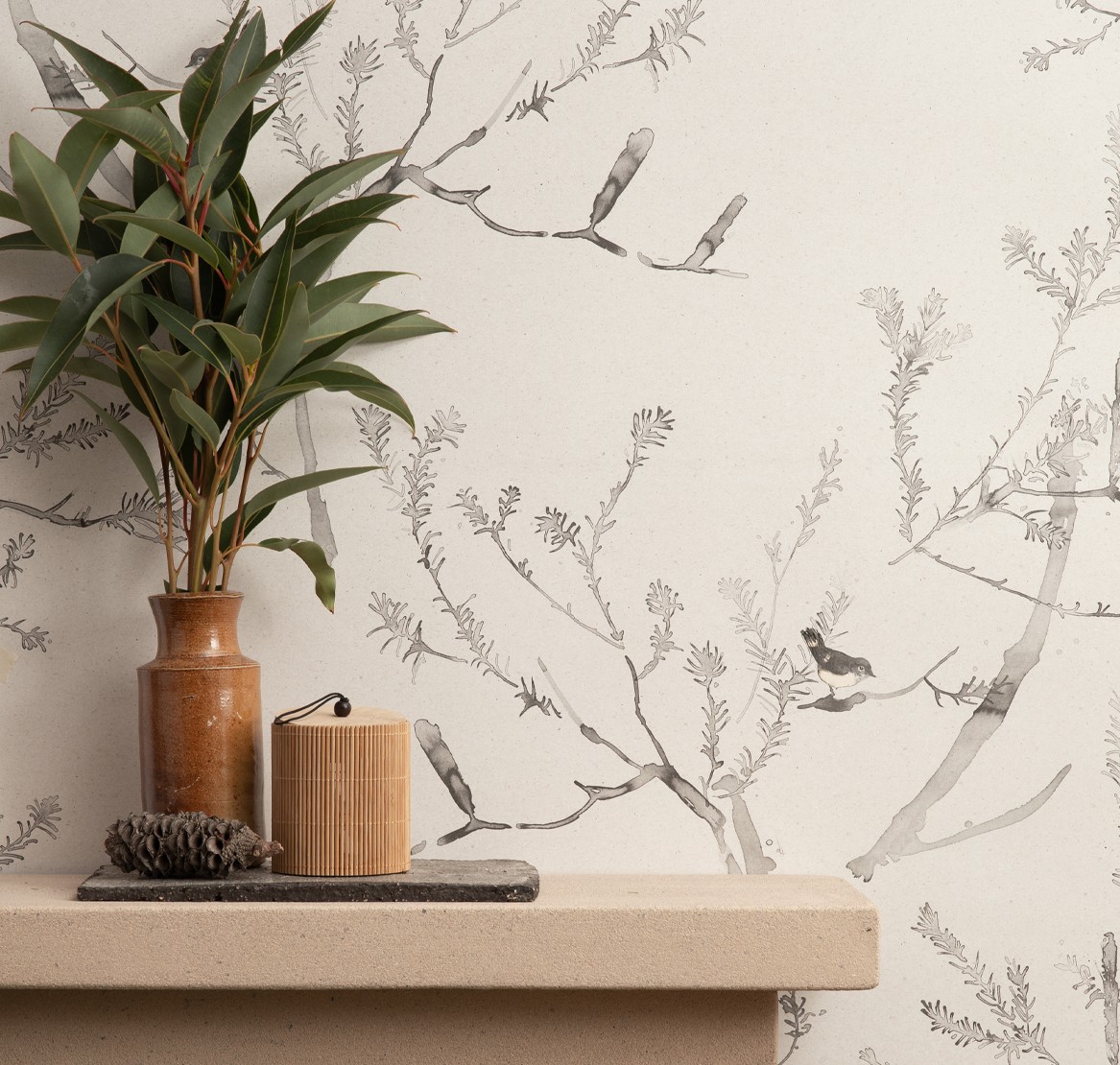 Native trees, shrubs and birds sketched in pen and ink, or charcoal: Coastland – Sketches from Botany Bay is a collection of four patterns in twelve colourways as both fabric and wallpaper.
