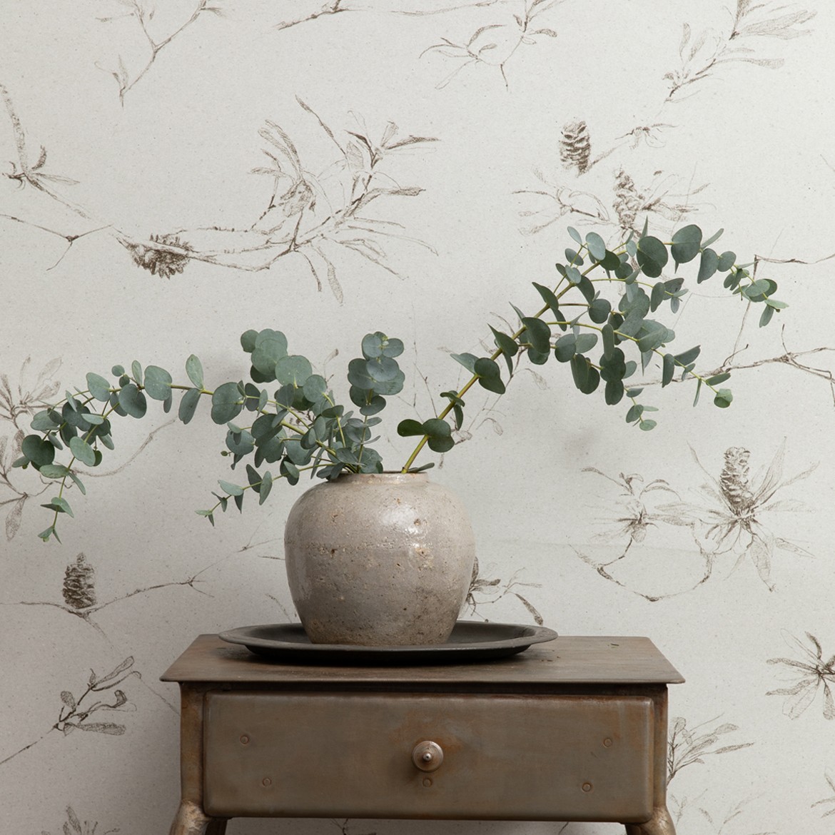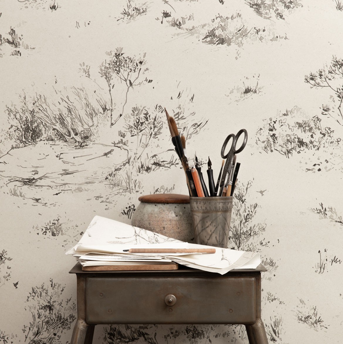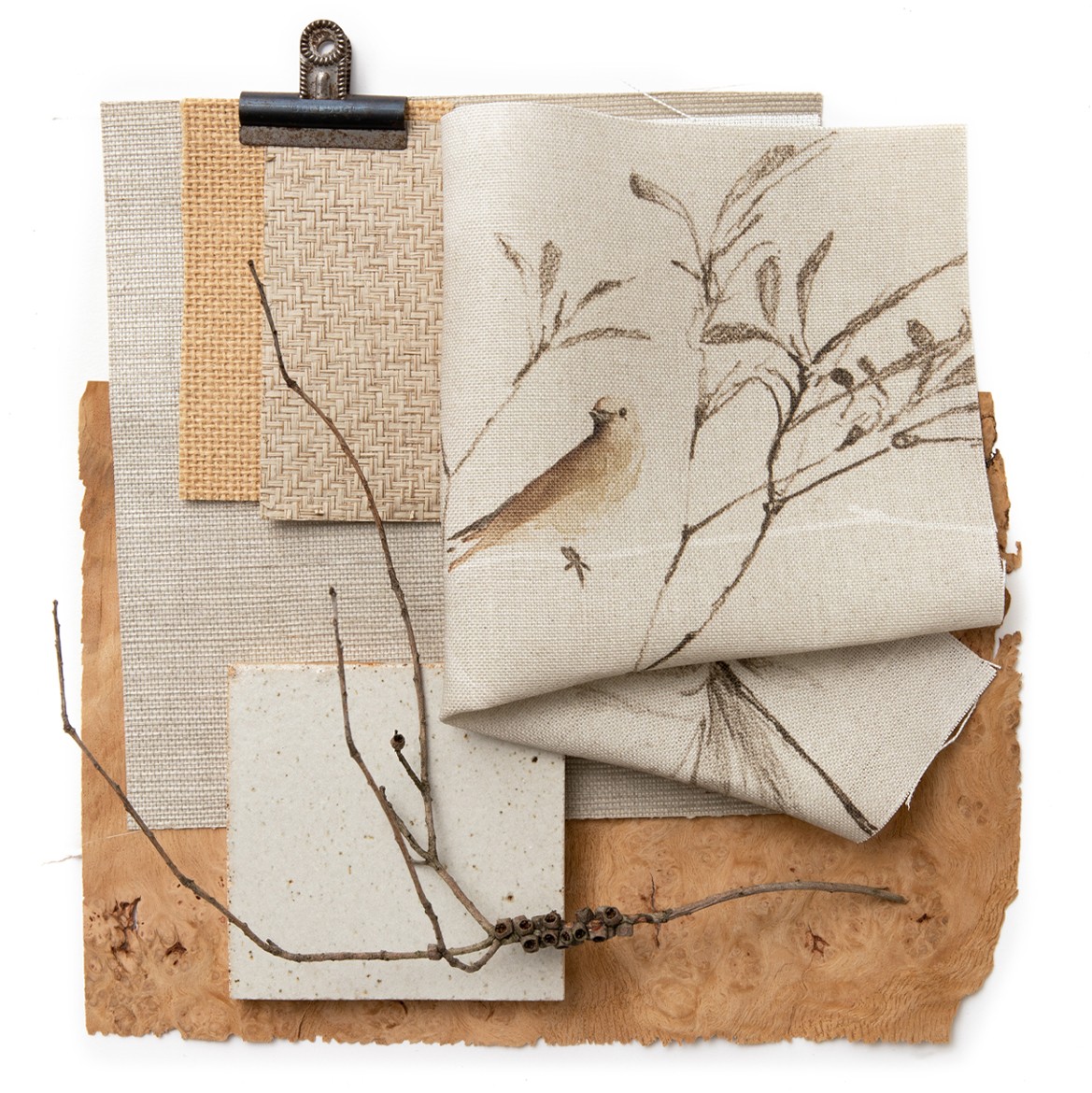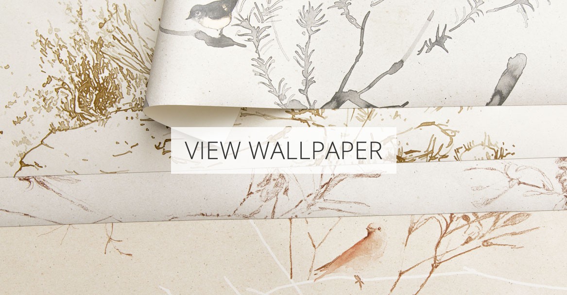 Native trees, shrubs and birds sketched in pen and ink, or charcoal: Coastland – Sketches from Botany Bay is a collection of four patterns in twelve colourways as both fabric and wallpaper.