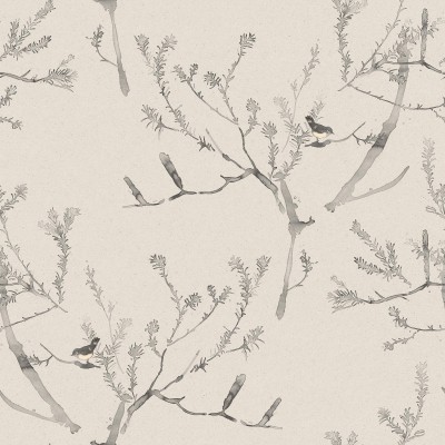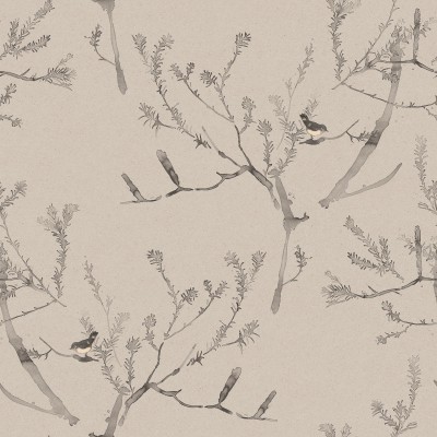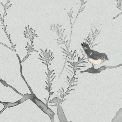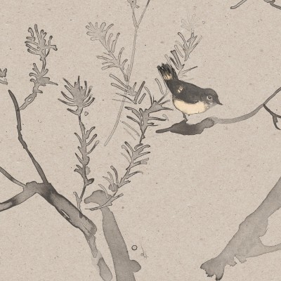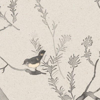 HEATH BANKSIA is a lively pattern in pen and ink with washes of watercolour. Delightful little birds flit in the branches of the feathery-leaved native tree.